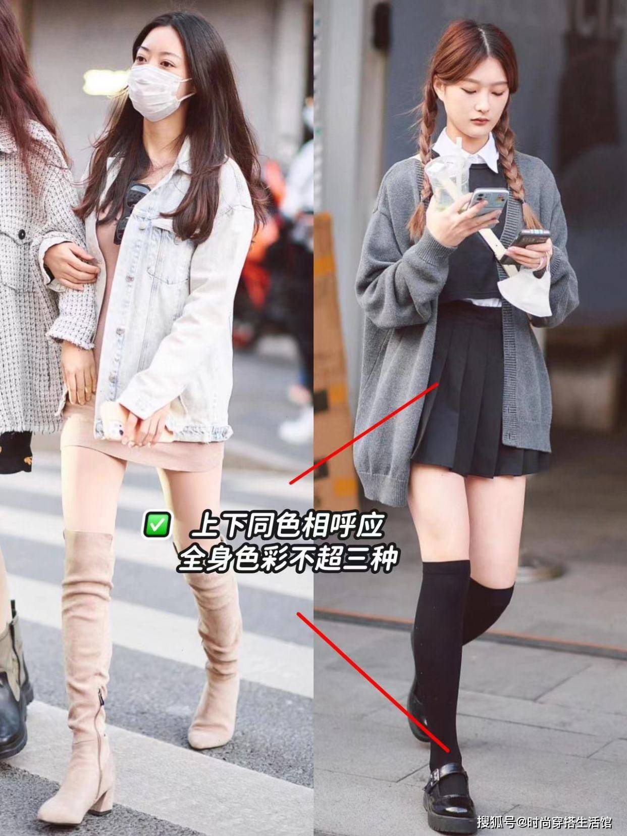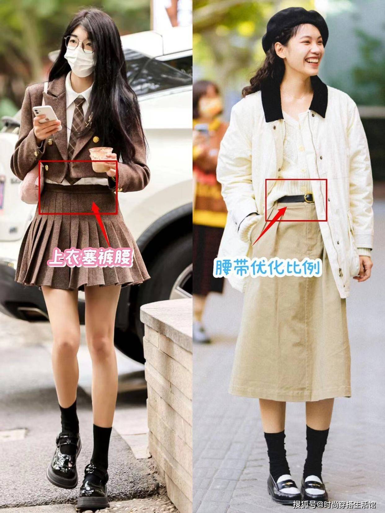 可以像左边这位小姐姐一样,在上半身使用更加吸睛的配饰转移视觉重心,去提高腰线。短挎包,腰包,围巾等适用于上半身的配饰都可以达到这个效果。