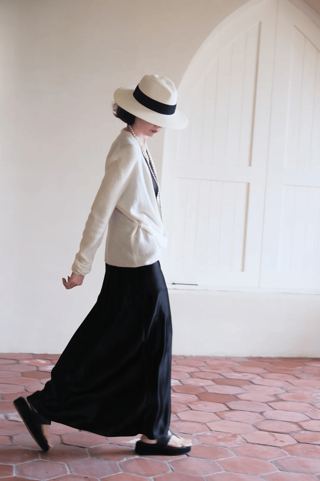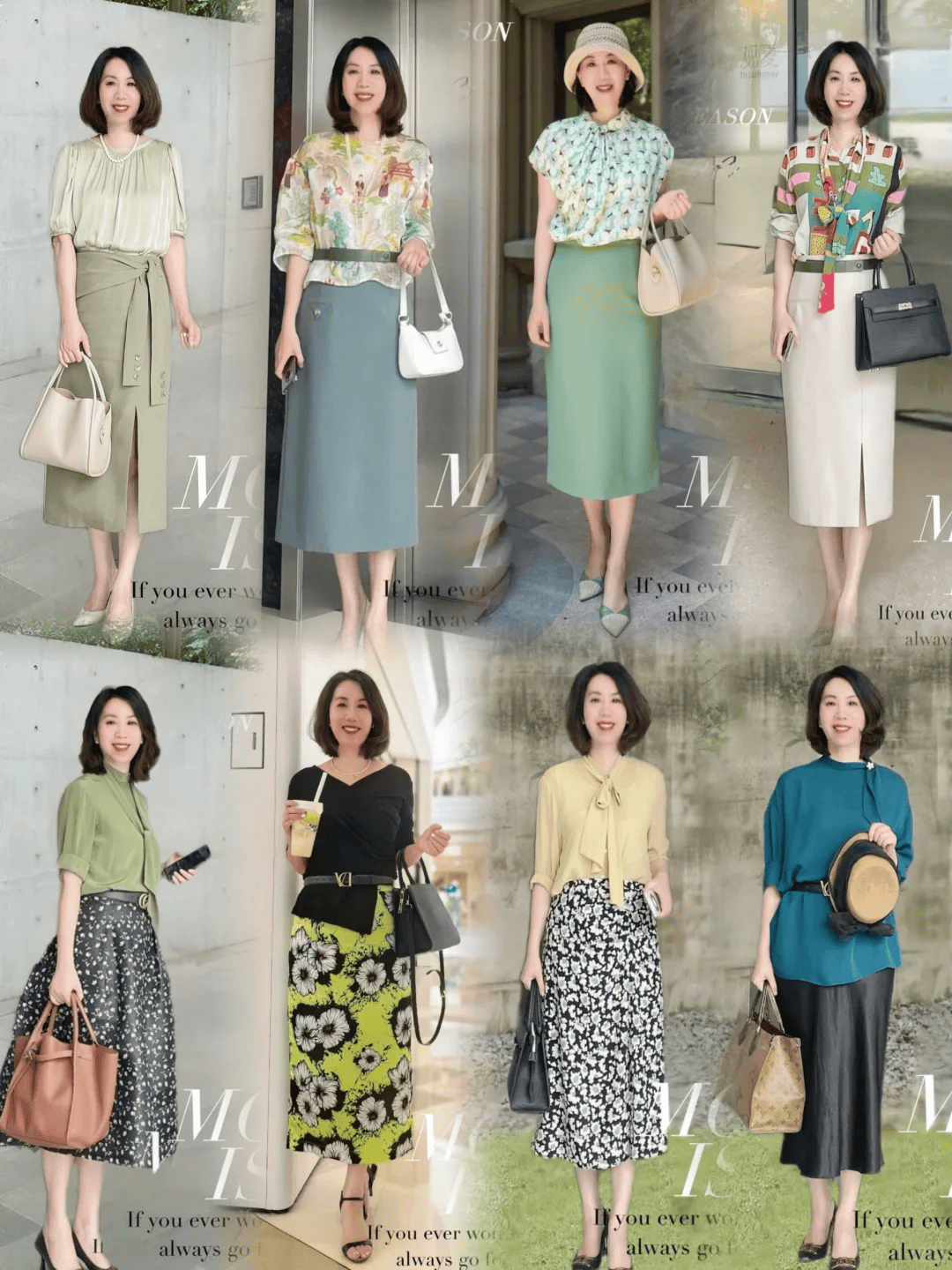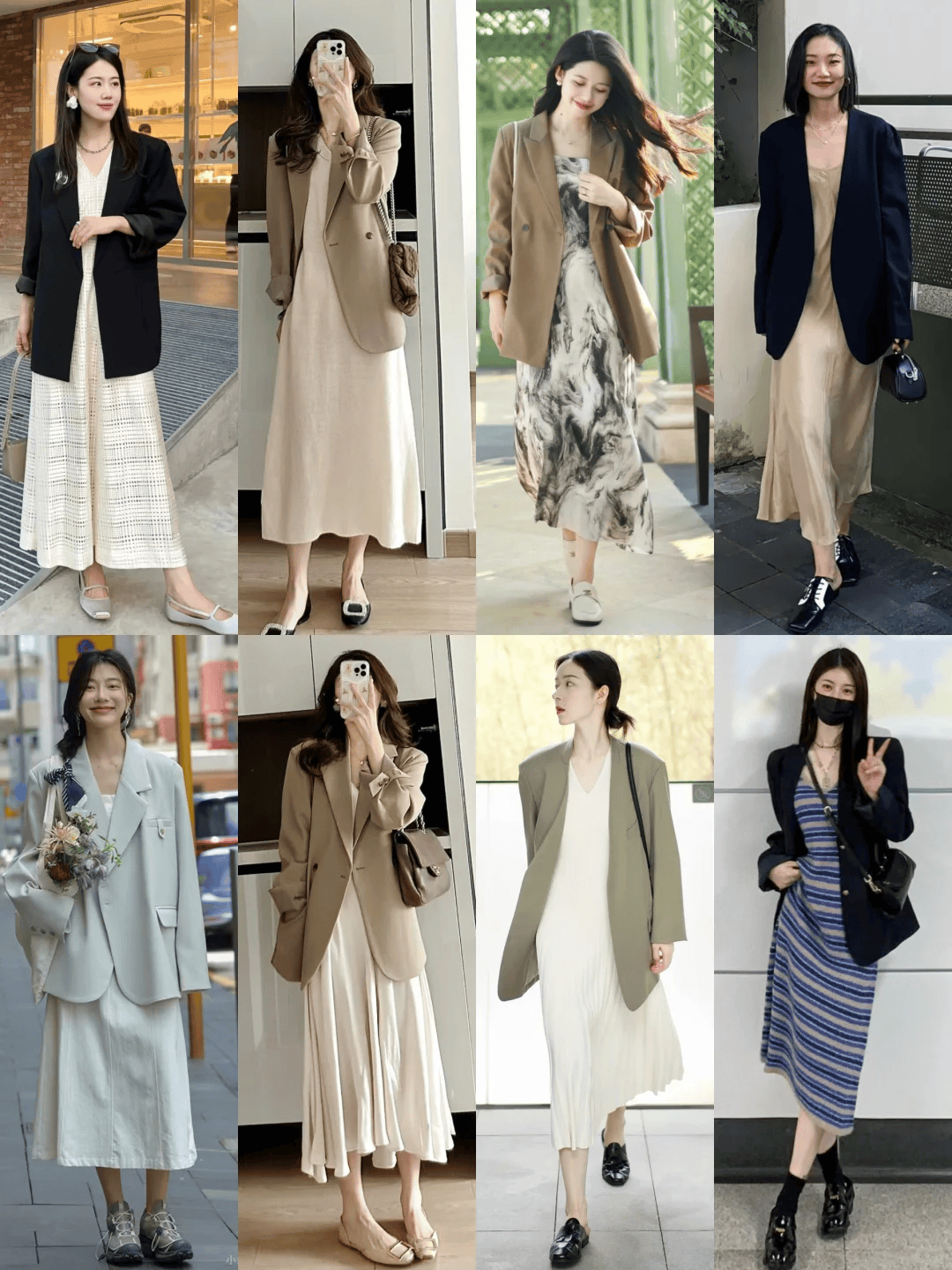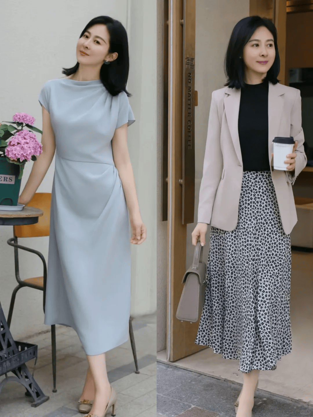 此外,V领、U领或是适度的露肤设计(如七分袖、及膝长度)都能在不失优雅的前提下,增加一丝轻盈感,适合早秋微凉的气候。