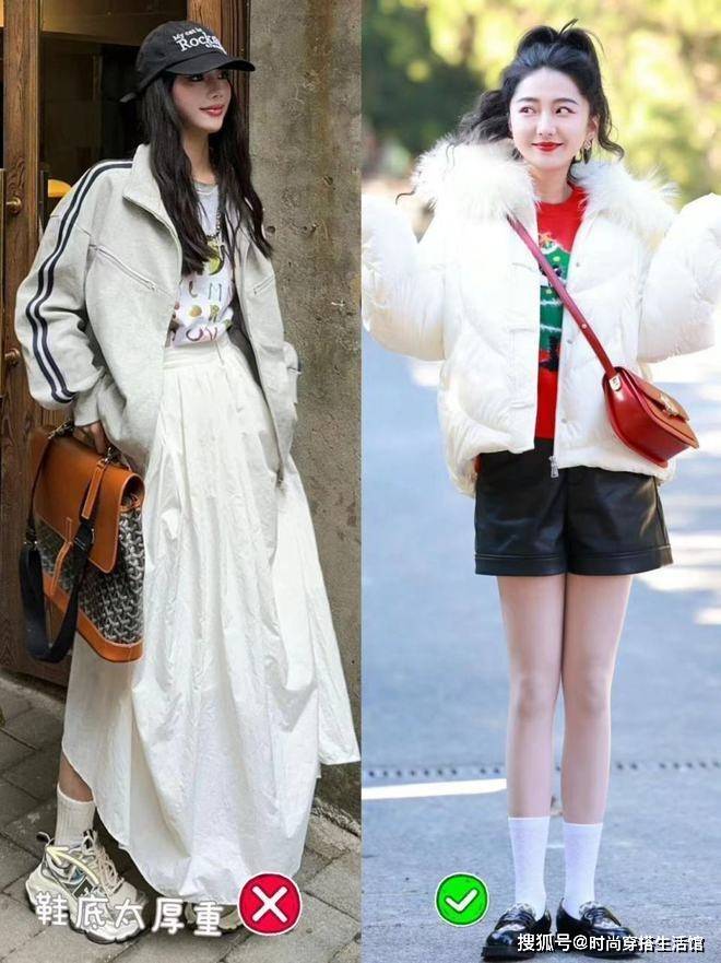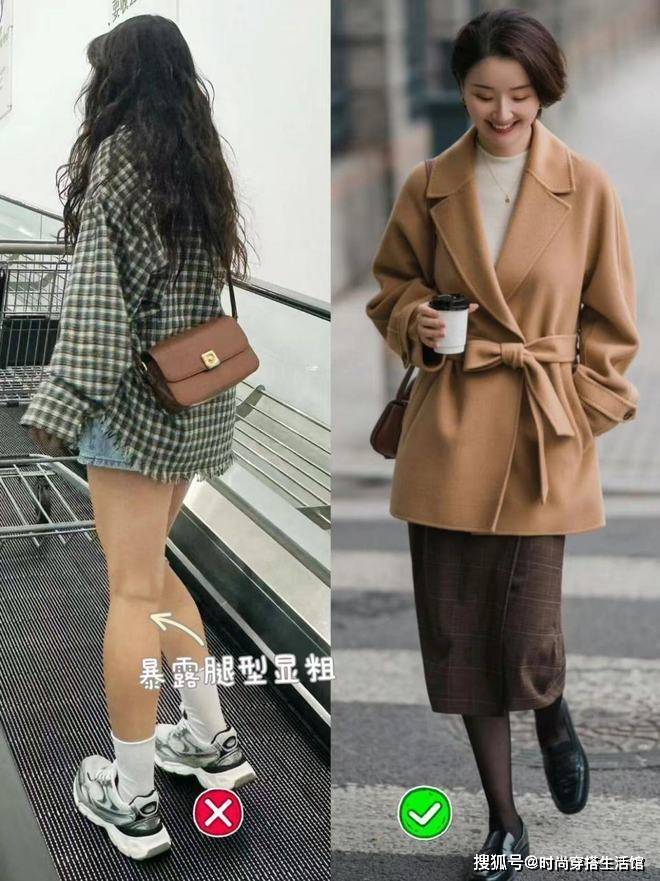 另外秋天在穿短裙、短裤之类的服装时,若是直接搭配运动鞋会将视觉重心下移集中到小腿上,比较考验腿型,更适合那些腿型纤细流畅的女性。若是你属于腿型不直或是小腿肌肉明显,那很容易更显腿粗。