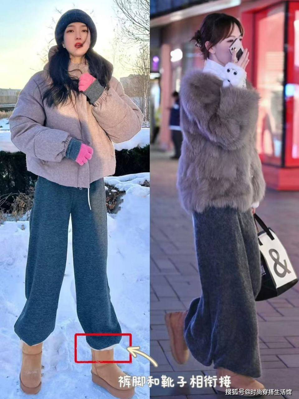 想要显瘦的姐妹们,就算要搭配这些长裤,穿的时候也可以去利用松紧结合的方式去修饰身形,避免臃肿感,如果你用这种宽松的雪地靴,再配上宽松的裤子,下半身完全没有向内收缩的设计,就很容易拉宽身材,非常不实用。