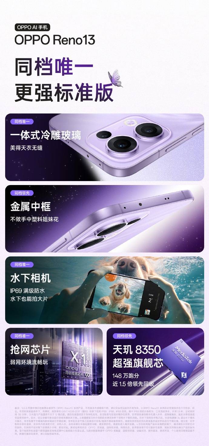 OPPO Reno13采用了旗舰级金属中框,升级iPhone同款的一体冷雕玻璃工艺,带来越级手感,拥有冠绝同档的好质感。主推色蝶蝶紫采用了蝴蝶翅膀元素,就像蝴蝶一样,在特定光线下,能看到蝴蝶羽翼般的光影流动。