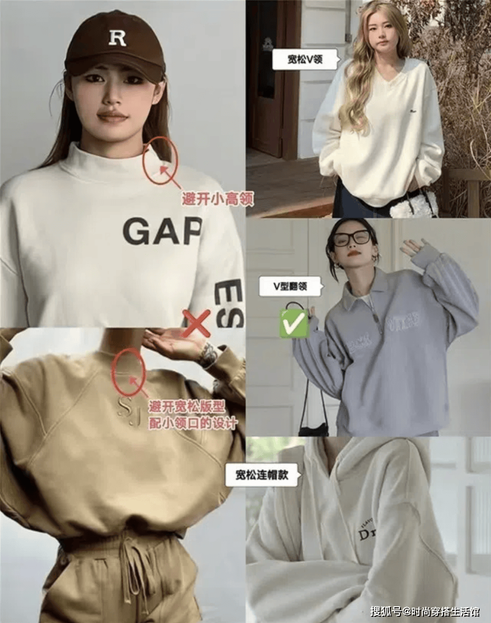 我们不烦选择大领口、低领口的卫衣能够拉长颈部、露出锁骨从而保持松弛感。反之那种小领口和紧身的领口设计也不推荐大家尝试。