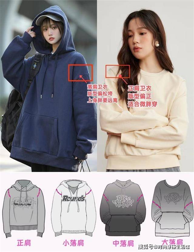 其次头大肩窄的话选择大落肩的卫衣,胳膊粗的女生要避开小落肩。反之胸大的女生不适合中落肩,溜肩的女生要避开大落肩设计的卫衣。