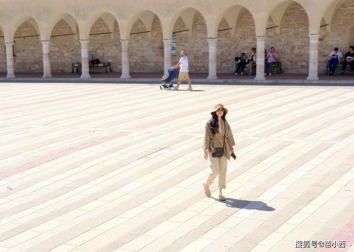 章小蕙漫步在国外的街头巷尾,沐浴着温暖的阳光,微风轻轻拂动她的发丝,她上身穿着一件宽松的燕麦色外套,柔和的色调如同春日里田野上的晨雾,给人一种宁静而温暖的感觉,戴着宽檐帽,真的很洒脱大方。