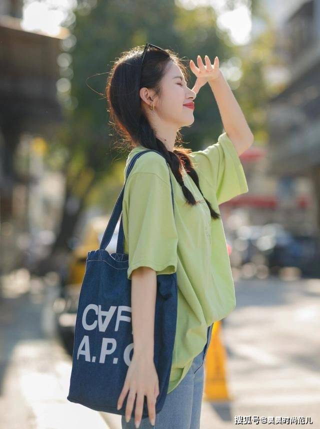 T恤+牛仔裤的穿搭方式,虽然经典,但是如果穿搭的不好,还是难显时尚。所以很女孩子们尽量尝试各种搭配方式。比如这身浅绿色大码T恤,半扎腰搭配宽松直筒牛仔裤穿搭,新潮随性,充满了青春活力。