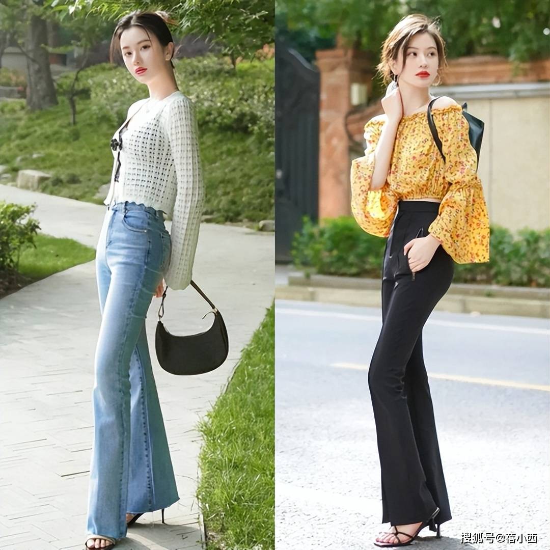 选择喇叭裤的时候,还有一些小姐姐甚至会去尝试非常个性的开叉设计,这种开叉的裤腿可以很好地在视觉上拉伸我们的双腿,延长比例,打造出高挑的效果,配上同色系的高跟鞋,也完全没有违和感。