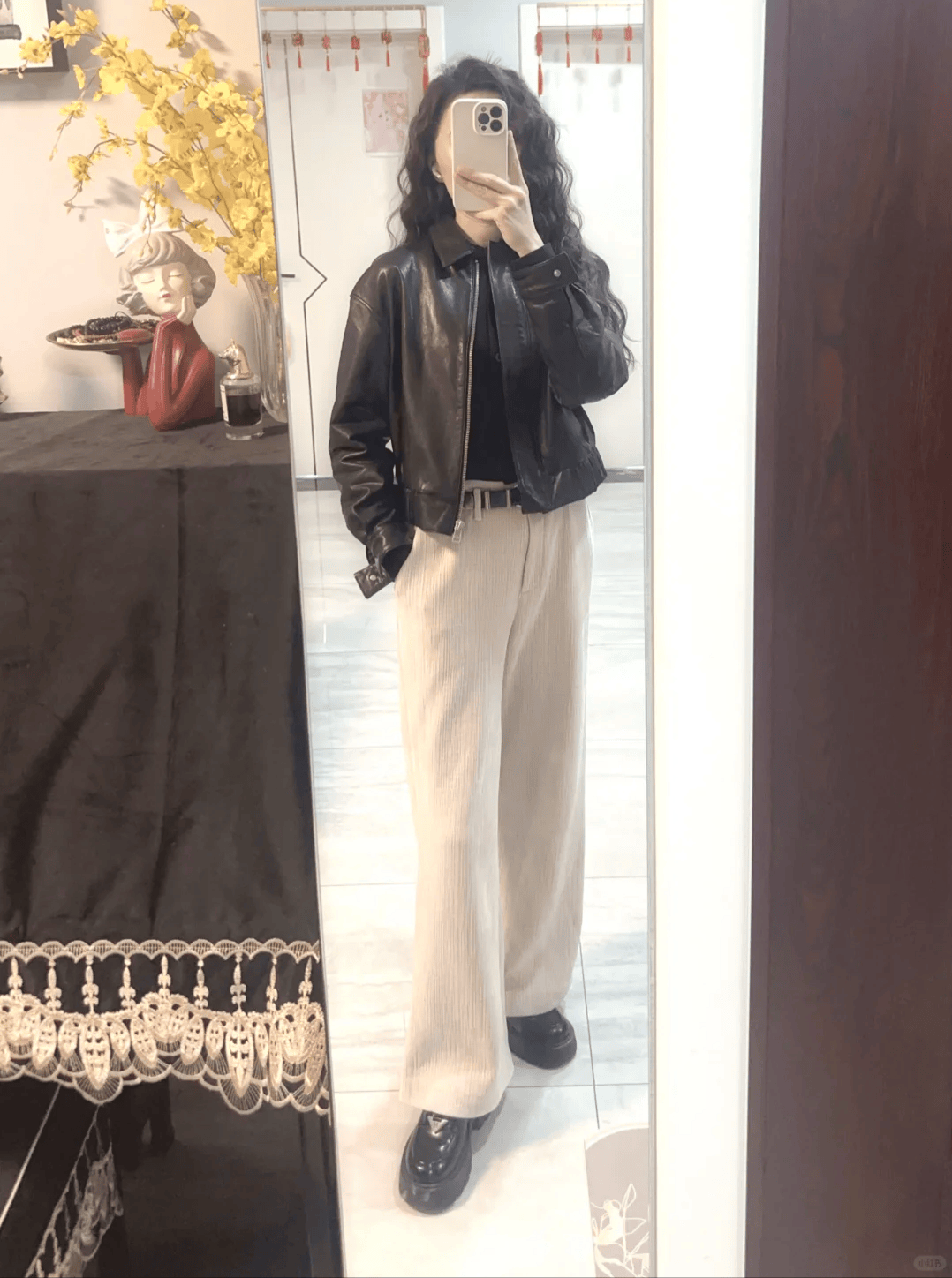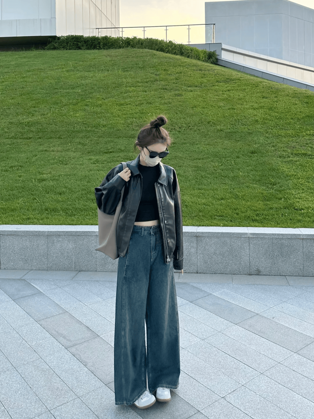 四、短款皮衣 + 阔腿裤:甜酷兼具的混搭风