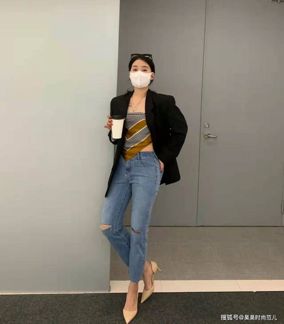 同样这身黑色西装外套+蓝色破洞牛仔裤,也借助了西装的干练利落,和破洞牛仔裤的个性时髦,用高腰的裤型设计,穿起来显瘦更显高挑,从而将女性独有的知性美感展露的淋漓尽致。