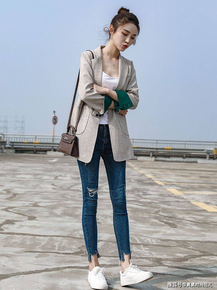 白色西服+九分牛仔裤+白色帆布鞋,干练利落的白色小西装外套,搭配减龄时髦的蓝色牛仔裤穿搭,高腰显瘦的小脚裤型设计,非常适合小个子女生穿搭。