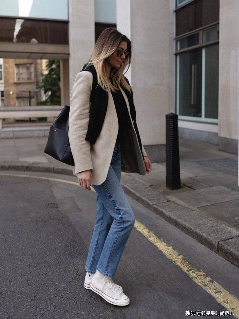 黑色西装+直筒牛仔裤+帆布鞋,成熟优雅的黑色小西装外套,与青春减龄的蓝色直筒牛仔裤搭配在一起,气场十足。下面随便搭配一双舒适透气的帆布鞋,又多了几分青春活力,多了几分率真感。