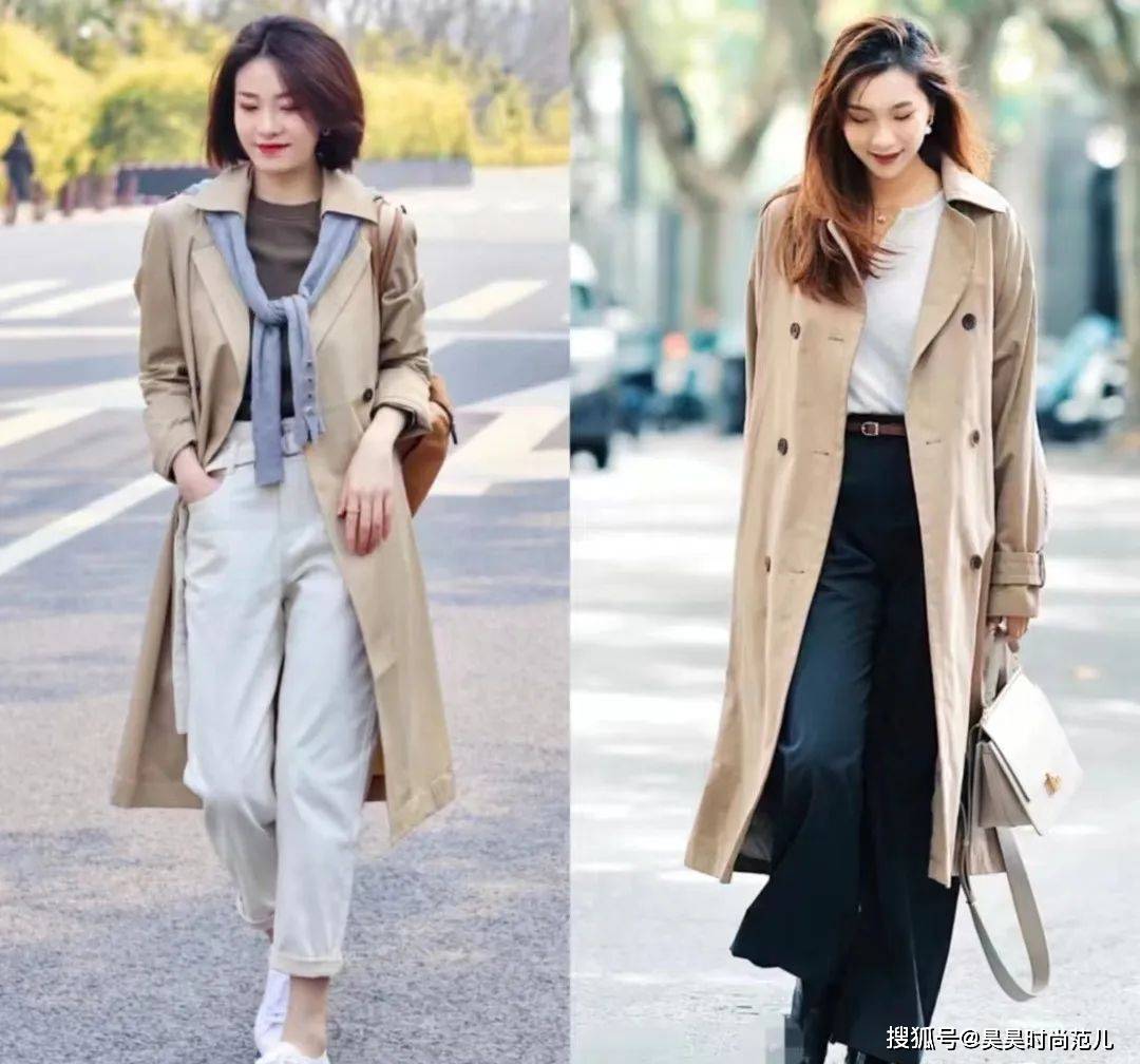 就像这身卡其色的风衣外套,里面无论是搭配咖色的T恤内搭,还是搭配白色的T恤内搭,时尚效果都非常OK,简单优雅,时尚洋气。