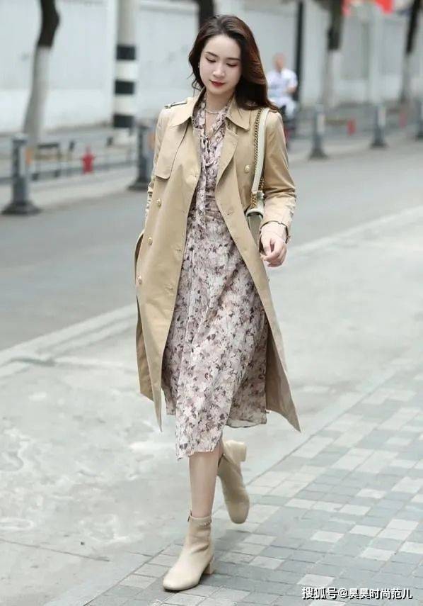 并且,裙装会比裤装更加修饰身材,比如这身卡其色的风衣外套,与漂亮的碎花连衣裙穿搭,简单的长+长的搭配既能够重点突出竖直线条,同时还显得人更加高挑!