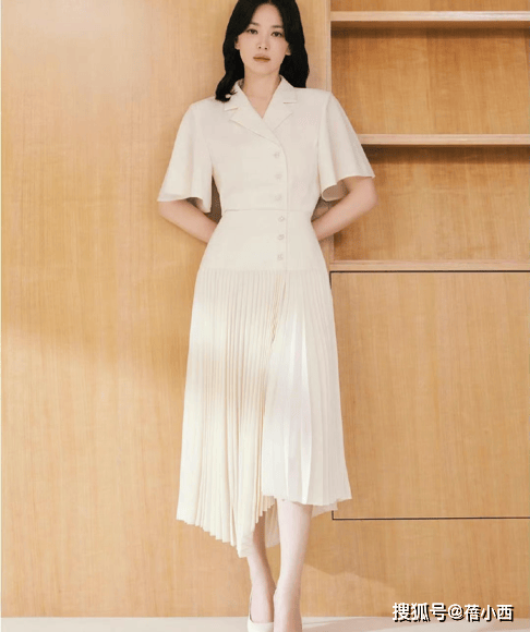 纯白色的连衣裙虽然在夏天很受欢迎,但纯白色上身还是会有一点显黑的,相比之下,米白色不仅会显得人随性优雅,而且还没有白色,对于肤色的要求度那么高。宋慧乔的这条衬衫裙整体的版型是很简单的,宽宽松松的大袖子,再加上收腰的设计很显瘦,完美的规避了上半身的赘肉。