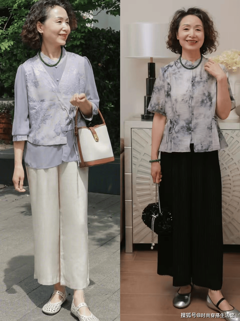 夏天我们选择上衣的时候,很多时候都会挑选贵气的面料,尤其是一些大龄女性很多时候会为了考虑气质,从而去挑选贵气的面料从而显得优雅和端庄。夏天穿针织材质的上衣其实是非常常见的,尤其是针织材质非常的亲肤细腻,但对于中老年女性来说,选择针织衫会过于的紧身,反而会有勒肉的感觉,像肩部粗壮、小肚子赘肉都会暴露出来。