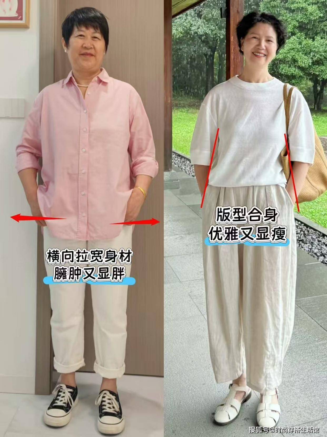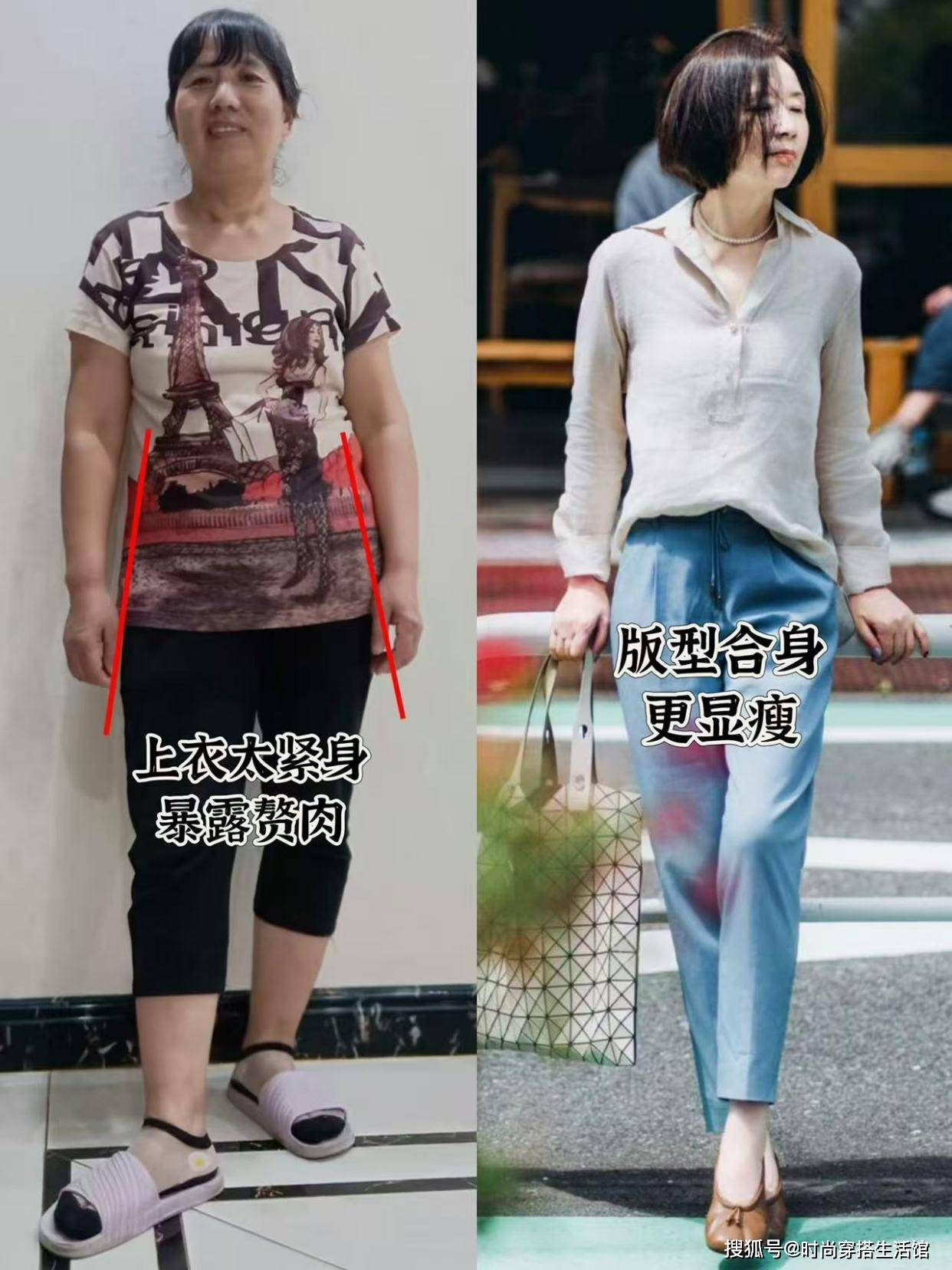 炎热的夏天,对于中年女性来说的话,我们选择过于宽松的服装会横向拉宽身材,看起来臃肿显胖,尤其是那些面料过于软塌,没有垂感的服装更容易让人显得肥胖。反之我们选择合身的上衣可以更好展现出身材曲线,从而让人看起来更加有型。如果大家不相信的话,建议看看这组穿搭对比,品味和气质反差感真的很大。