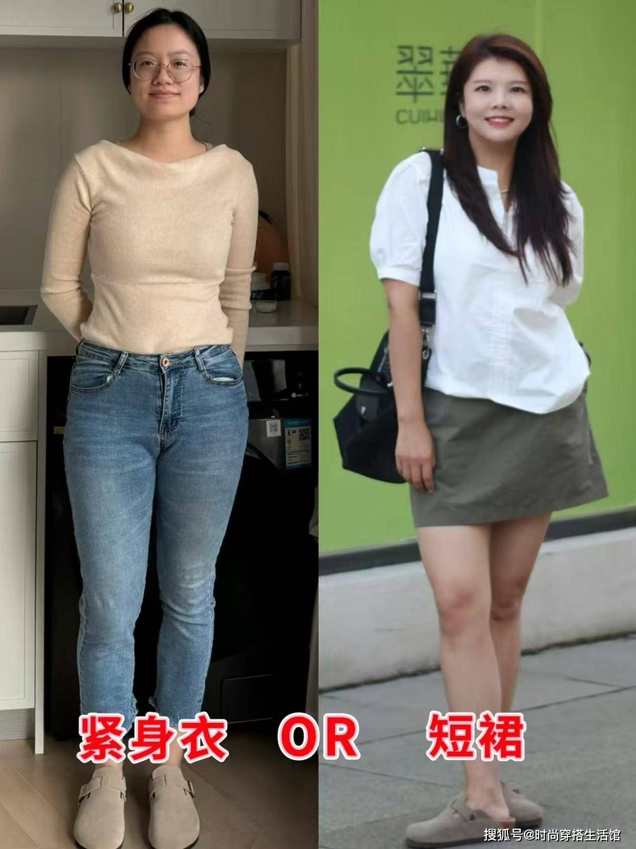 <对比三>夏天穿紧身衣配短裙,显得头重脚轻