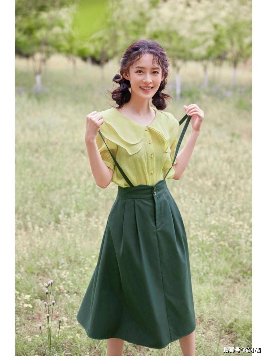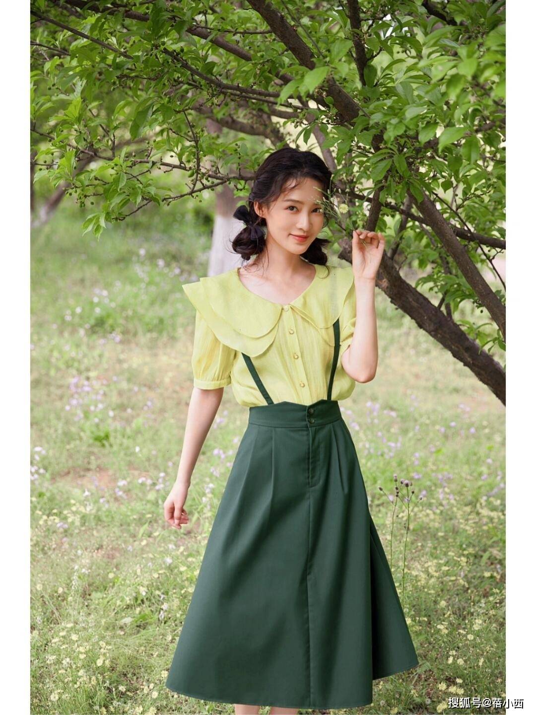 深绿色裙子生活中穿的人不多,因为搭配不好会显老,其与黄色搭一起十分减龄。