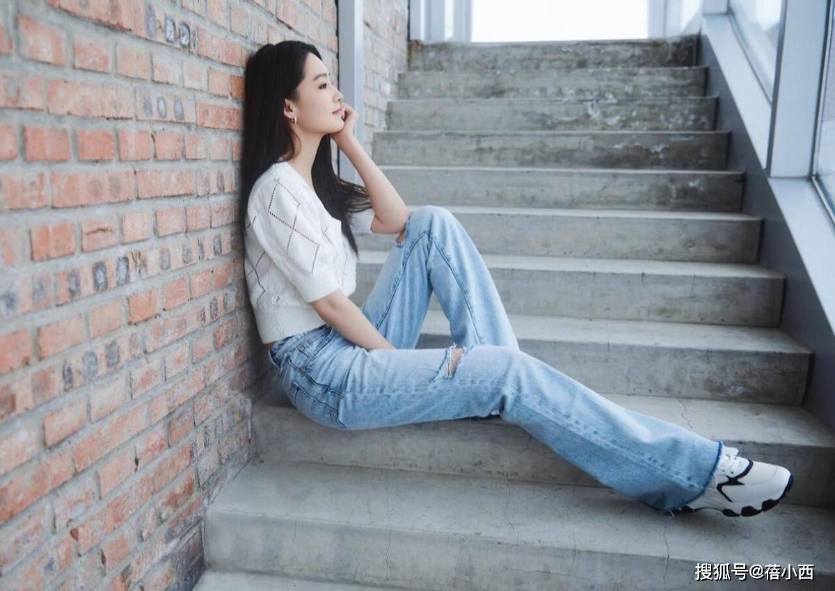 蓝牛仔裤常与白鞋搭配,养眼的同时十分显年轻。