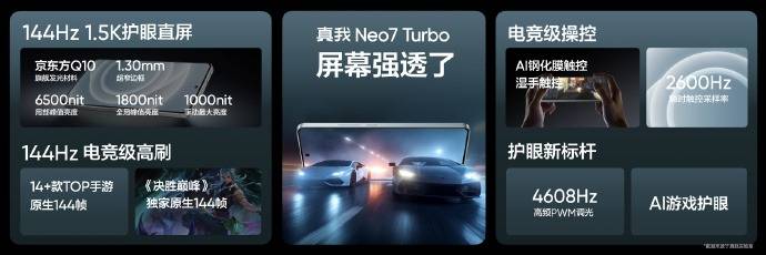 真我Neo7 Turbo内置自研电竞抢网芯,Wi-Fi延迟至高降低39%,确保在游戏中网络信号稳定,延迟更低。真我Neo7 Turbo配备了一块6.8英寸的1.5K京东方直屏,支持144Hz刷新率,采用4K档旗舰同款的京东方Q10发光材料,画质通透更舒适。真我Neo7 Turbo的局部峰值亮度高达6500nit,全局激发亮度2000nit,手动亮度1000nit。