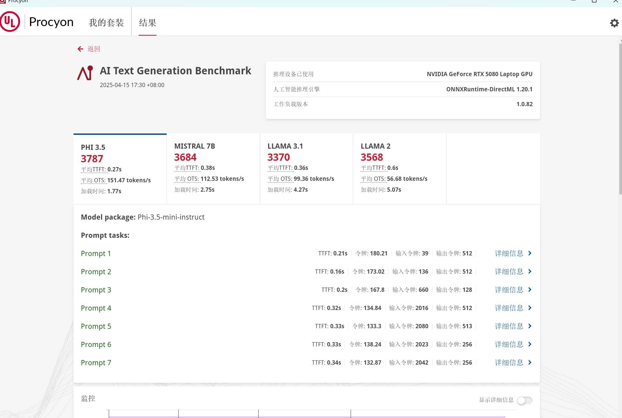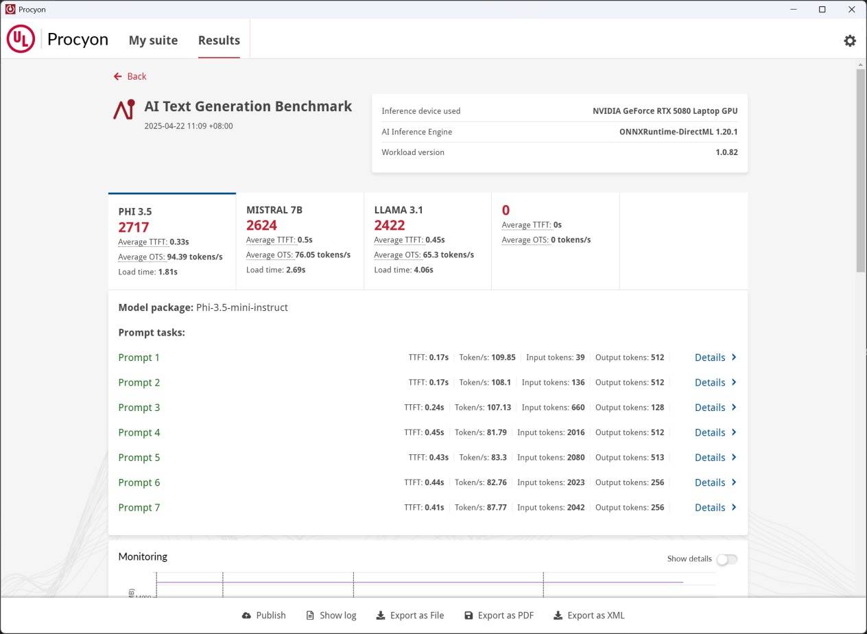 在Procyon的AI Text Generation Benchmark中,宏碁暗影骑士·擎7 Pro取得了PHI 3.5 3787分,MSTRAL 7B 3684分,LLAMA 3.1 3370分,LLAMA 2 3568分的成绩。四个测试项都超过3000分的成绩,彰显了宏碁暗影骑士·擎7 Pro的强劲AI实力