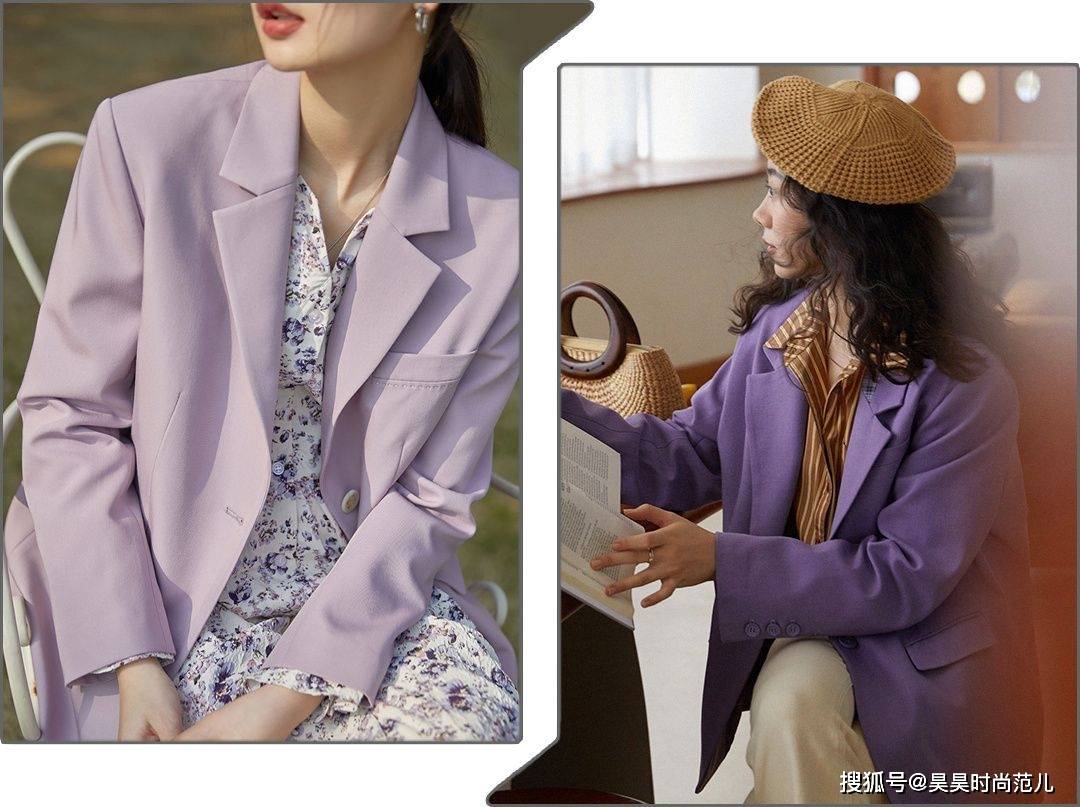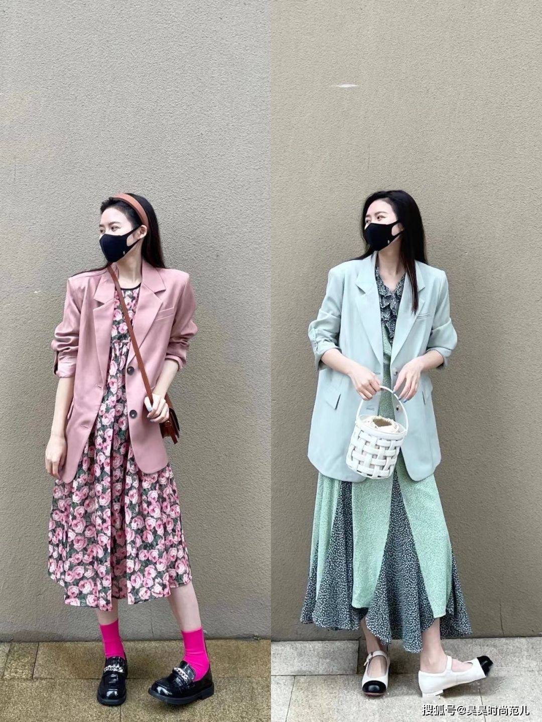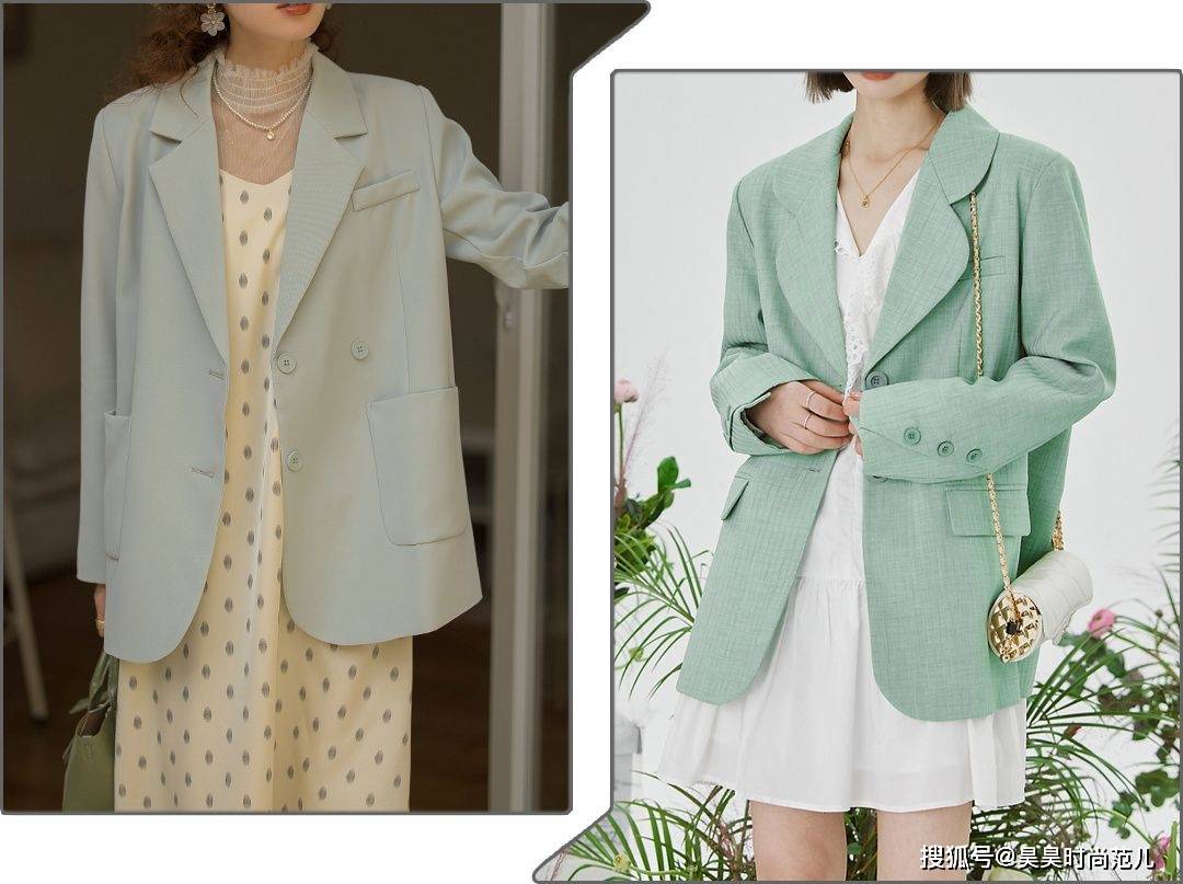 就像上面这两套小西装搭配,灰白色的小西装外套,与漂亮的波点连衣裙搭配,或是减龄的浅绿色小西装外套,搭配纯白色的V领连衣裙穿搭,都是非常不错的选择。