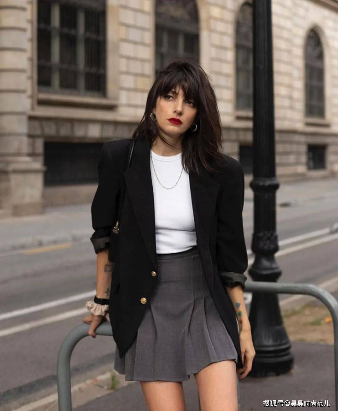 经典的黑色西装外套,相信大家都不陌生,它可谓是西装外套中出镜率最高,百搭效果最佳的色系。用经典的黑色小西装,搭配烟灰色的百褶裙穿搭,经典的小短裙,与气质的小西装搭配在一起,知性优雅又显气质。
