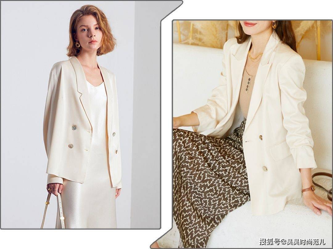 纯白色的小西装外套,干净素雅,干练利落。直接搭配一条纯白色的缎面连衣裙穿搭,确实要比搭配一条漂亮碎花半身裙穿搭,更显高级时尚感。