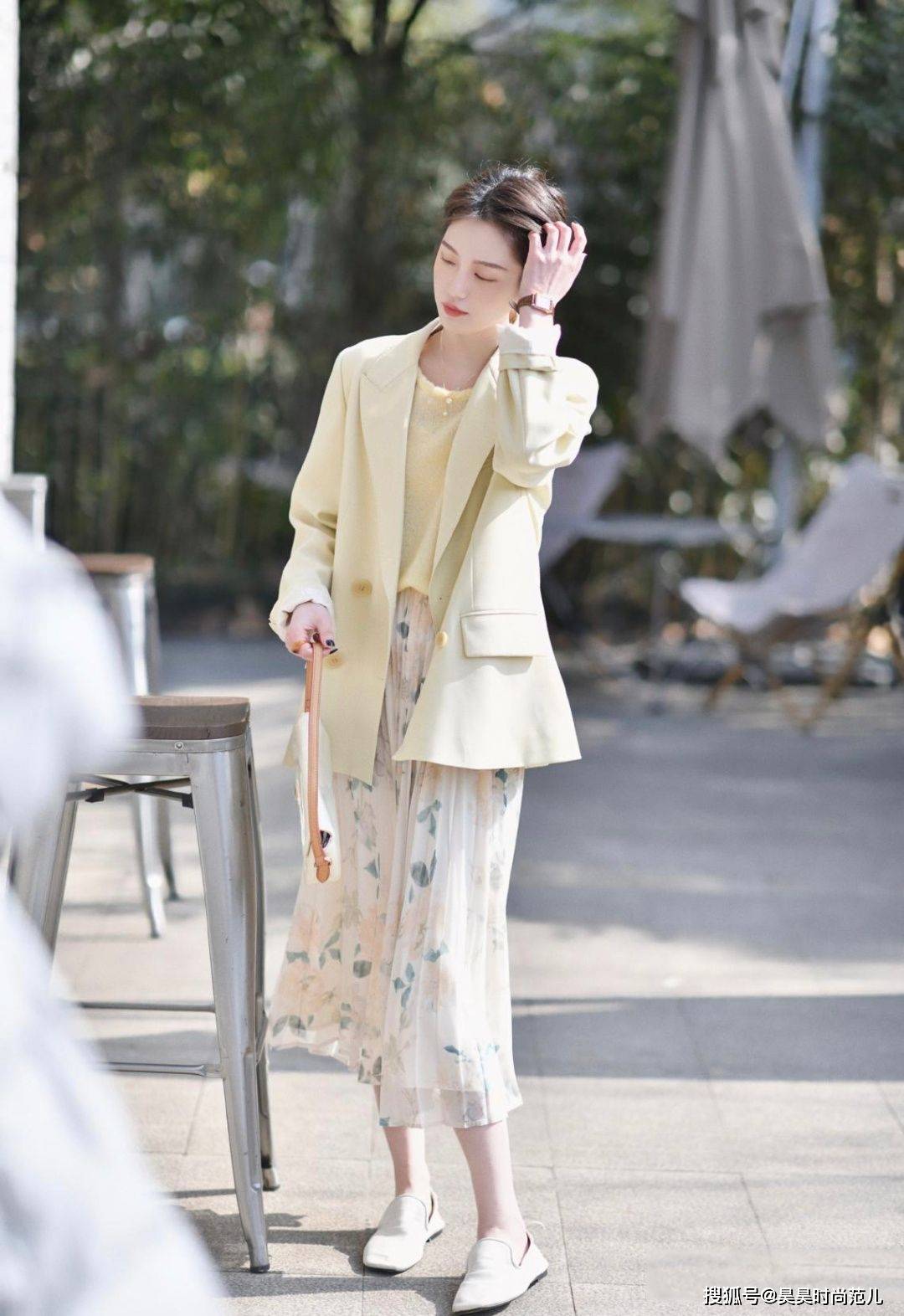 微风习习,在暖和的初春时节,用一件气质简约的淡黄色小西装外套,搭配一条漂亮的碎花半身裙穿搭。轻盈利落的雪纺碎花裙,与宽松显瘦的淡黄色小西装外套搭配在一起,轻盈利落,减龄优雅,可盐可甜,上身尽显高级时尚感。