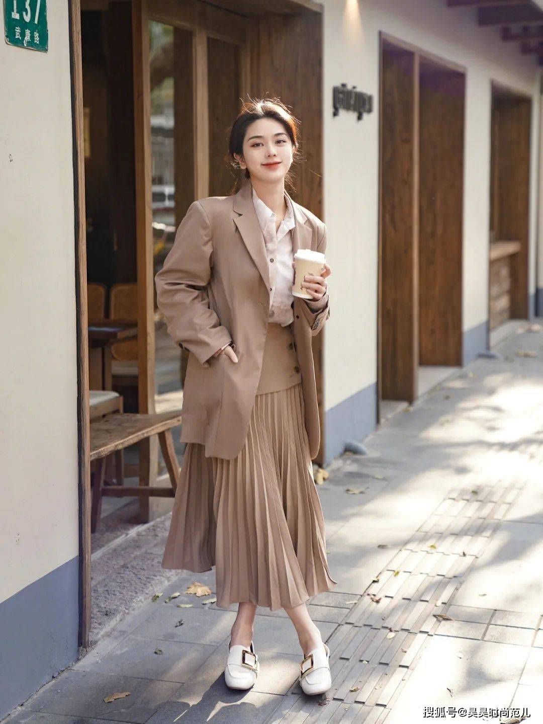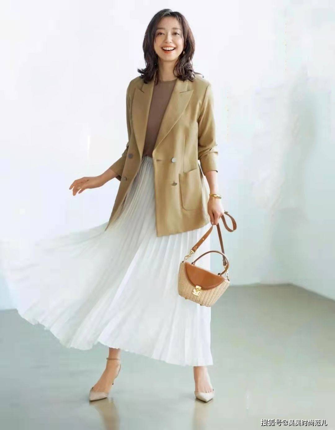 如果想要穿搭得简约时尚,但是又不想只是同色系的搭配,那么可以试试这身卡其色小西装,搭配一条纯白色百褶裙穿搭。两种浅色系的搭配,虽然简约,但是丝毫不失时尚魅力。