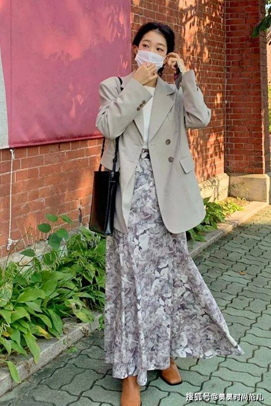 又或者是在阳光明媚的午后,用一身气质简约的灰白色小西装外套,搭配一条漂亮的雪纺碎花半身裙,高腰显瘦的裙型,在风中轻盈飘逸。其实,有时候简单变换一下材质,就能让整体的穿搭更具时尚感。