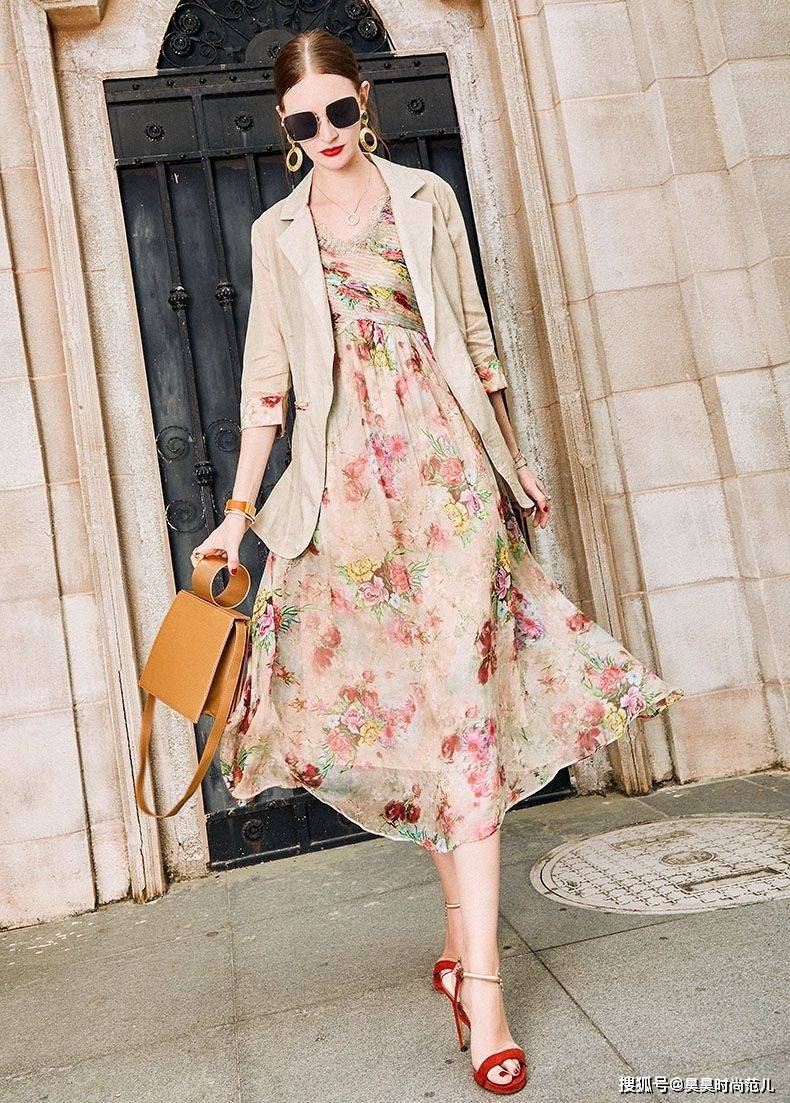 前面说气质的小西装外套,搭配漂亮的碎花裙很好看,又显气质。其实,气质的小西装外套,搭配漂亮的印花连衣裙,也是非常不错的选择。就像这身裸色小西装外套,搭配一条轻盈飘逸的雪纺印花连衣裙穿搭,简约优雅,通勤休闲,尽显高贵女人气质。