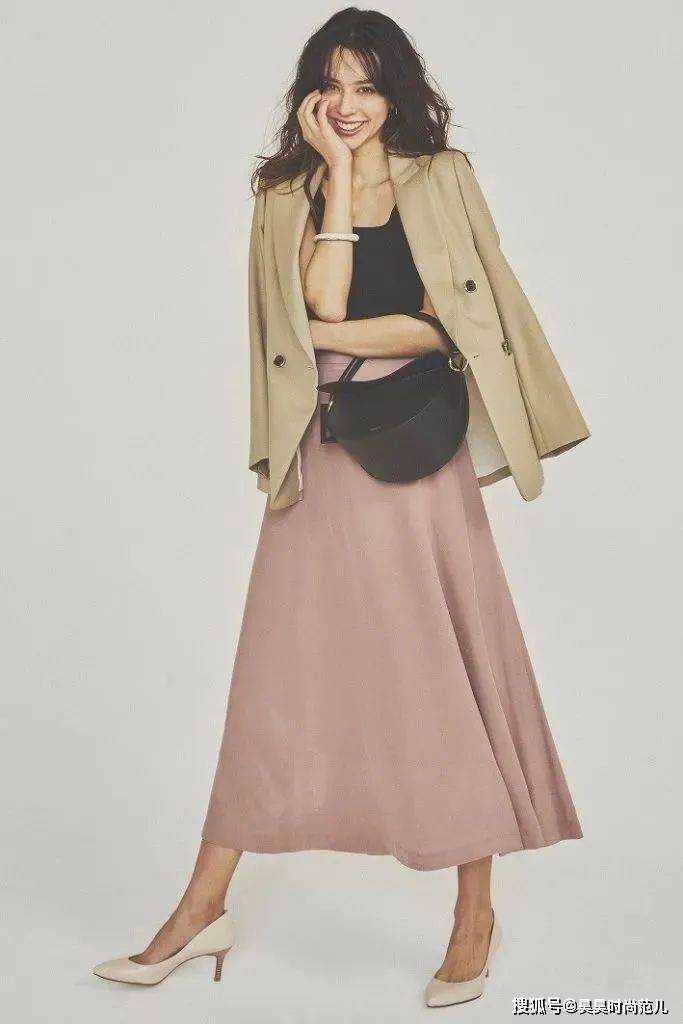 由于伞裙特殊的裙型设计,能够更好地修饰腰身,从而达到轻松显瘦的效果。就像这身卡其色小西装外套,搭配淡粉色的高腰半身裙穿搭,高腰显瘦的裙型设计,穿在身上本就具有非常不错的显瘦显高挑的效果。