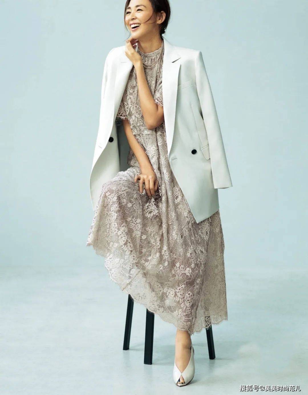 还有这身气质简约的浅蓝色西装,搭配漂亮的薄款蕾丝连衣裙穿搭,稍带透视感的蕾丝连衣裙,与端庄优雅的西装外套搭配在一起,大方优雅,尽显十足女人魅力。