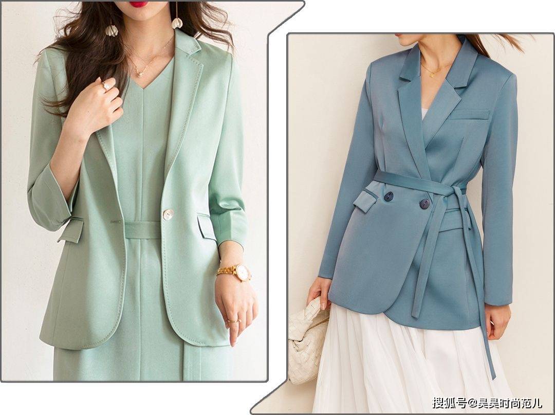 其实,在流行的小西装中,除了经典的黑白灰之外,还有这种自带清新感的浅绿色和浅蓝色系的小西装外套,也备受关注。搭配同色系的连衣裙穿搭,给人的感觉清爽自然,通勤时尚,无论是上班穿搭,还是休闲穿搭都非常合适,超显气质。