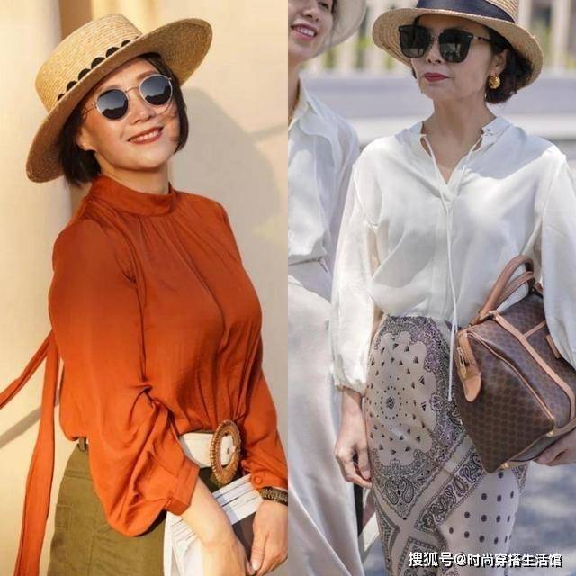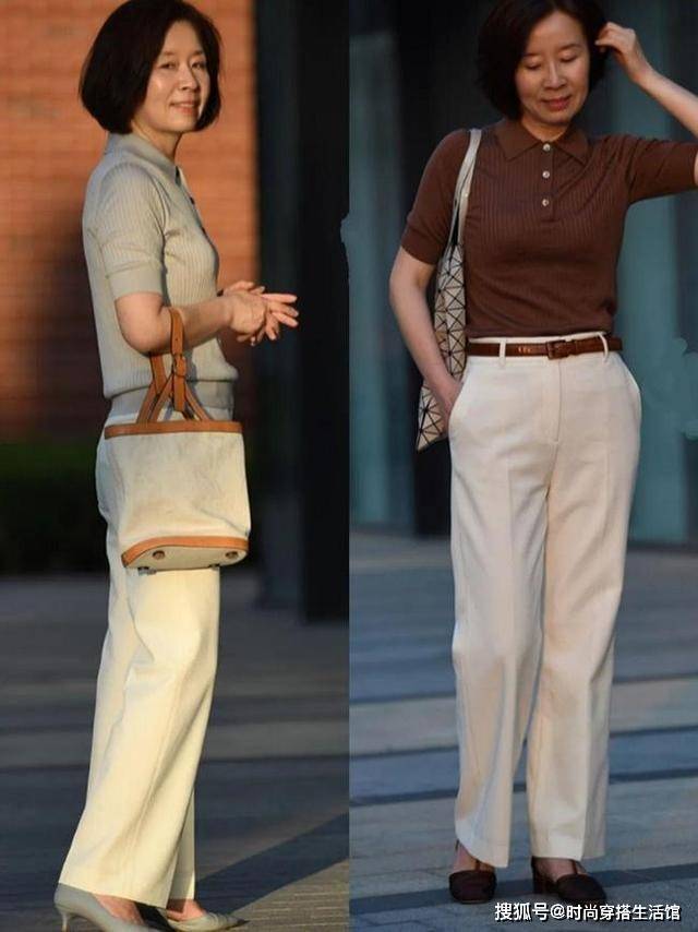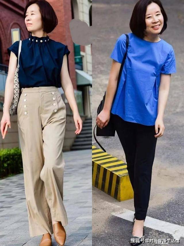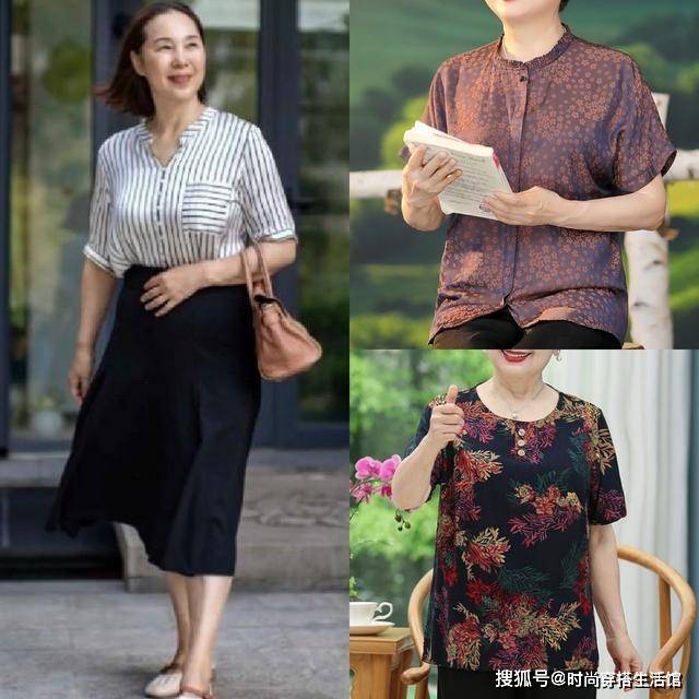 毕竟到了这个年纪,大部分女人难免会有些小赘肉,所以上半身比较厚实的就选V领加宽松袖口等,要是骨架比较小或者上半身比较瘦削,可以用小圆领或者小短袖等,这样会更显年轻活力。