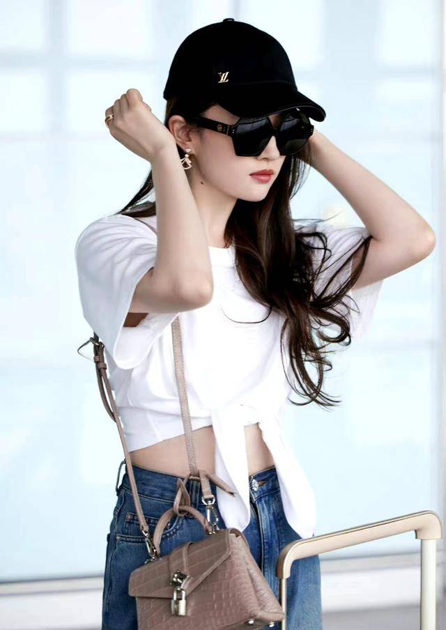 刘亦菲现身机场,简约露腰白T恤搭配牛仔阔腿裤,清爽又时尚