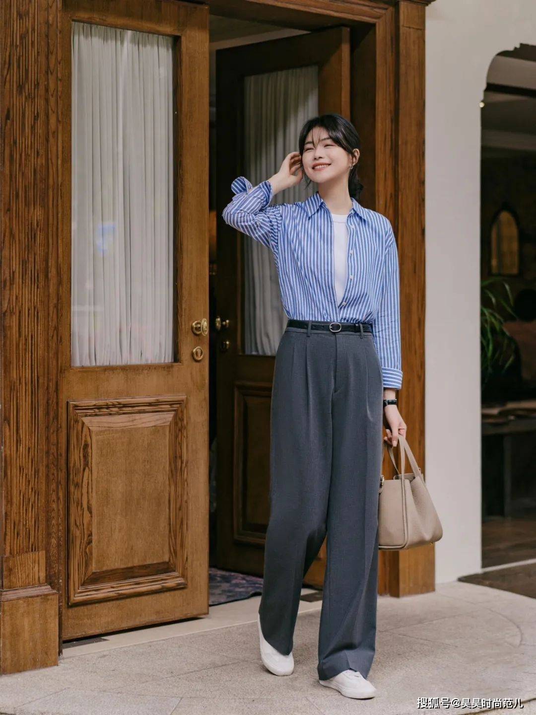 当然,有人觉得单纯的纯色系衬衫,穿搭起来难免有些单调,所以这里再给大家分享一条蓝白条纹衬衫,搭配灰色高腰阔腿裤穿搭。气质简约的蓝白条纹衬衫,通勤休闲,减龄时尚,与宽松大方的灰色阔腿裤搭配在一起,不管是上班穿,还是日常穿都很不错。