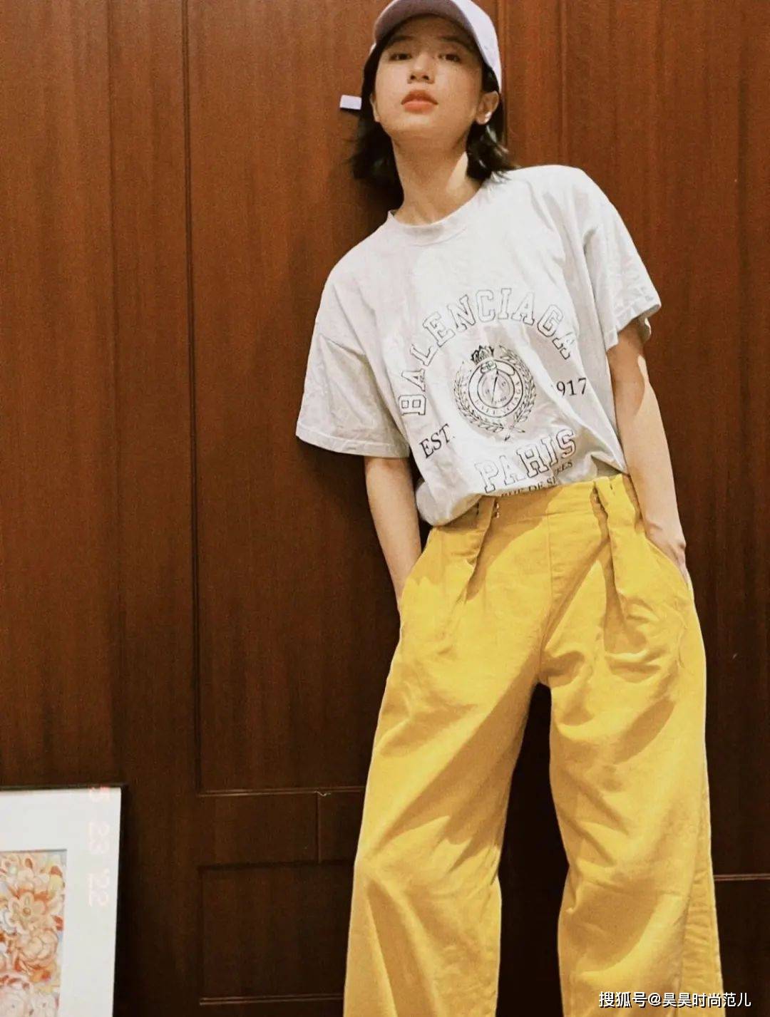 或者是利用明亮色系的黄色调阔腿裤,搭配简单百搭的白色短袖T恤穿搭。白色与黄色相互结合,减龄效果立马就凸显了出来。简单宽松的白色短袖T恤,与同样宽松的黄色阔腿裤搭配在一起,自带满满的青春时尚感。