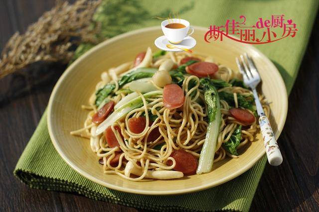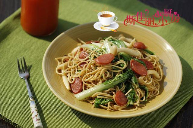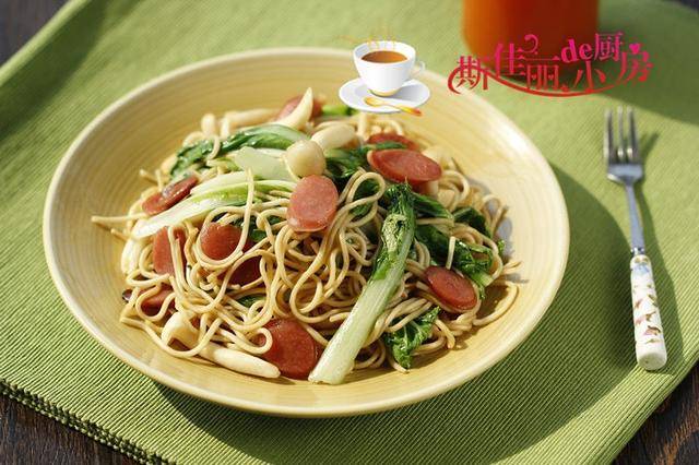 制作:1. 准备好原材料; 2. 烧热锅放入适量的油, 加入香肠片放进锅中翻炒几下; 3. 加入白玉菇放进锅中翻炒至八、九成熟; 4. 将热干面放进锅中翻炒几下; 5. 加入1勺生抽翻炒上色; 6. 加入洗净的青菜放进锅中翻炒几下; 7. 微微变色后加入少许盐和胡椒粉调味; 8. 翻炒均匀即可;