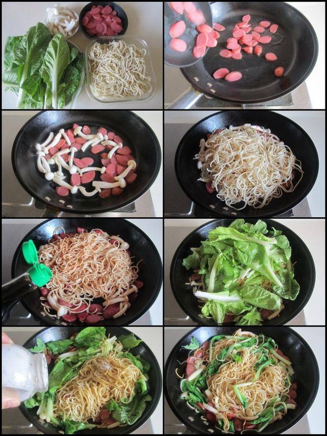原料: 热干面 1盘 香肠 1根 白玉菇1小蝶 白菜 2颗 生抽 1勺 胡椒粉 少许 油盐 少许