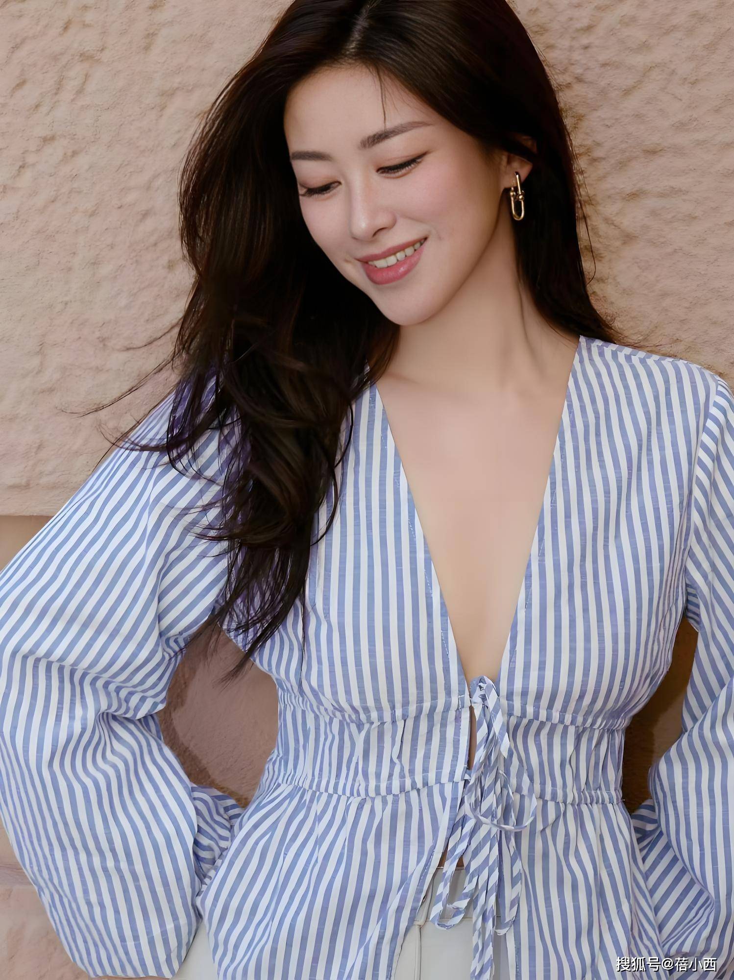 身上这件除了白色外,就是深蓝色,竖纹设计养眼的同时极具时尚魅力。