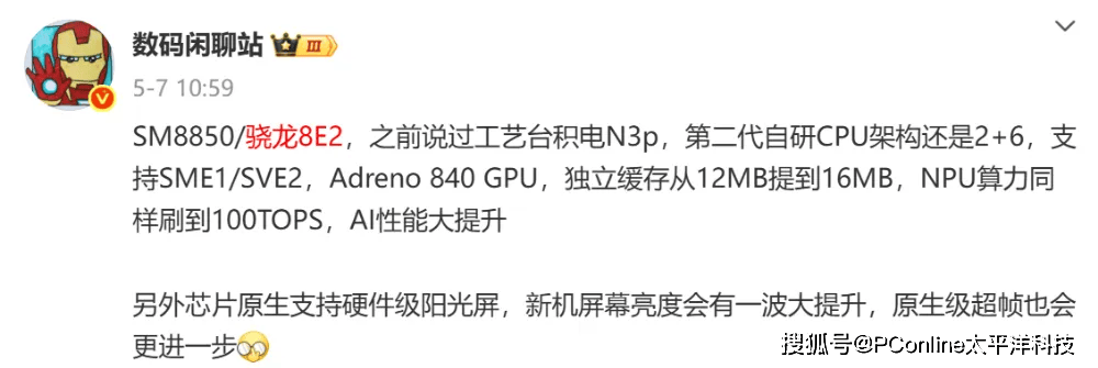 骁龙8至尊版作为去年骁龙旗舰芯片,采用高通自研的Oryon架构CPU,2个超级大核+6个性能内核,频率达到4.32GHz;而第二代骁龙8E也依然采用相同架构,并保持2个超大核+6个性能大核设计,集成Adreno 840 GPU,独立缓存从12MB提到16MB,NPU算力刷到100TOPS,AI性能大幅提升。