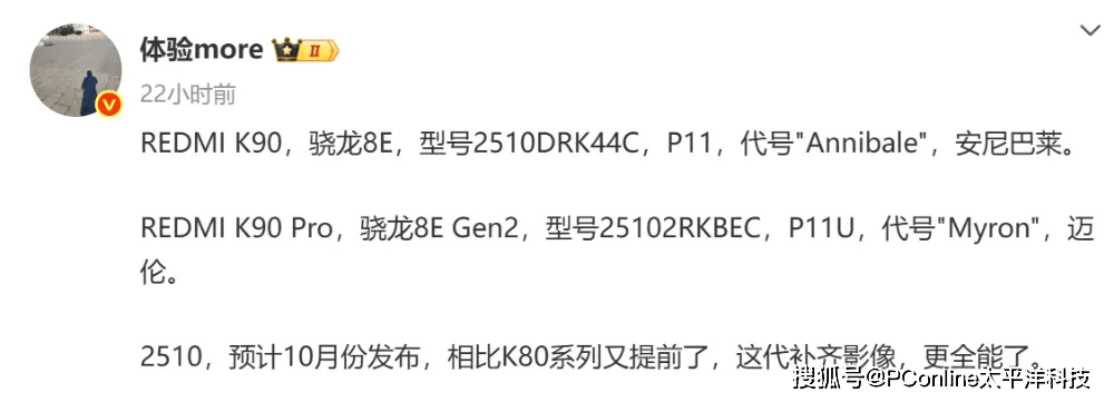 博主“体验more”的爆料也印证了这一规律,爆料显示,REDMI K90代号“Annibale”,安尼巴莱,搭载骁龙8E(即骁龙8至尊版)处理器,REDMI K90 Pro代号“Myron”,迈伦,搭载8E Gen2(第二代骁龙8至尊版)处理器。