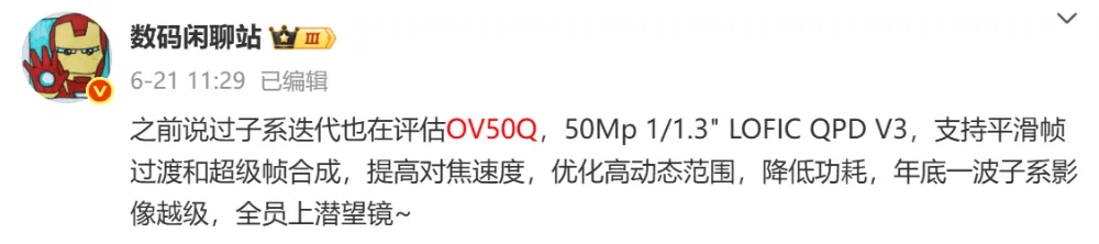 据博主“数码闲聊站”爆料,某厂子系列迭代在评估OV50Q,5000万像素1/1.3英寸LOFIC QPD V3,支持平滑帧过渡和超级帧合成,提高对焦速度,优化高动态范围,降低功耗。该机预计为REDMI K90系列。