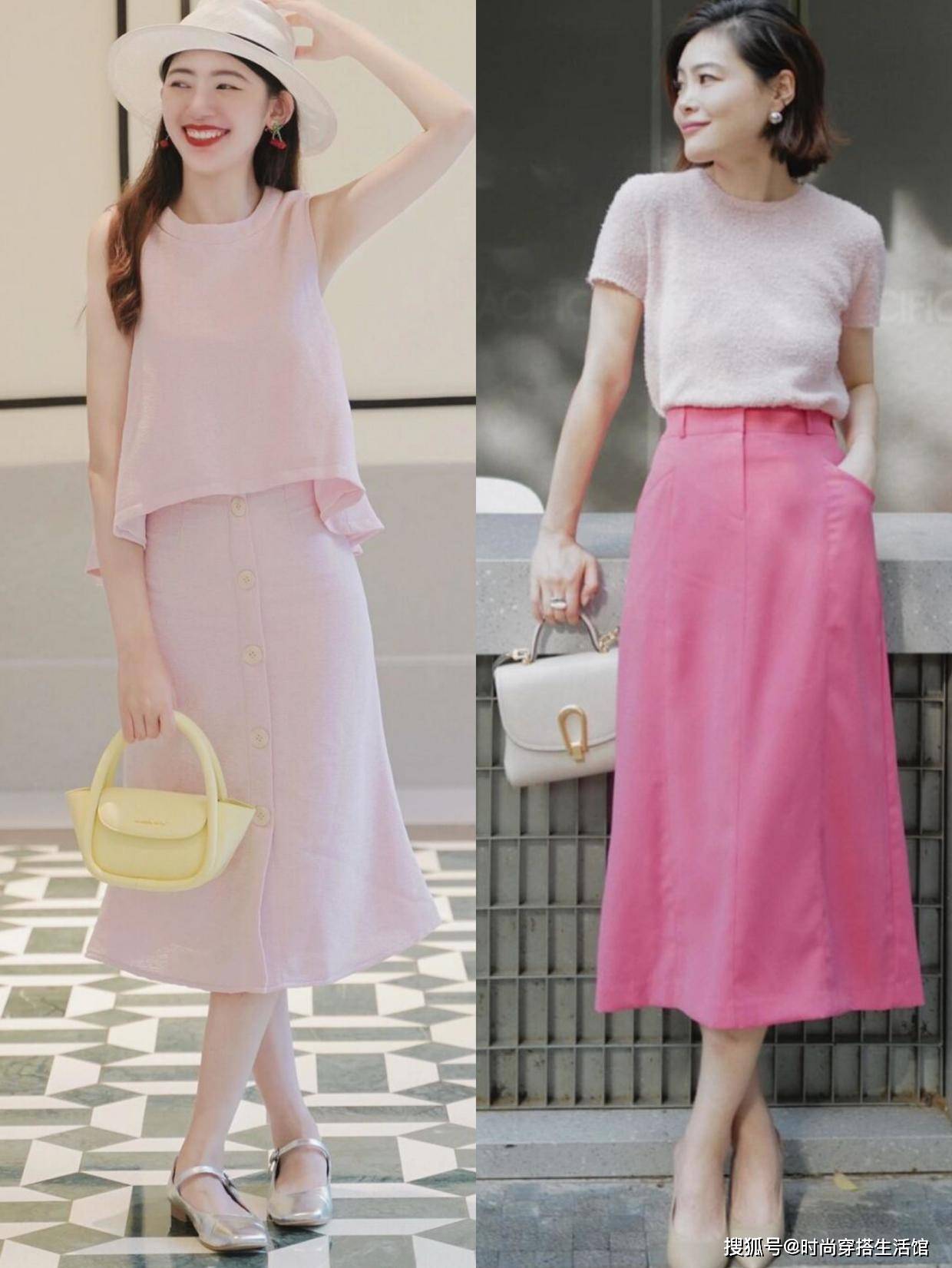 也可以选择不同深浅的颜色进行搭配,比如浅灰色+粉红色,视觉上既可以营造出渐变的效果,又能更好的划分身材比例,通过高腰的裙装提高腰线,拉长下半身比例,塑造出三七分的身材。