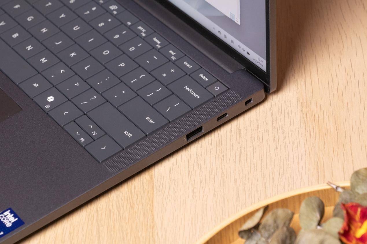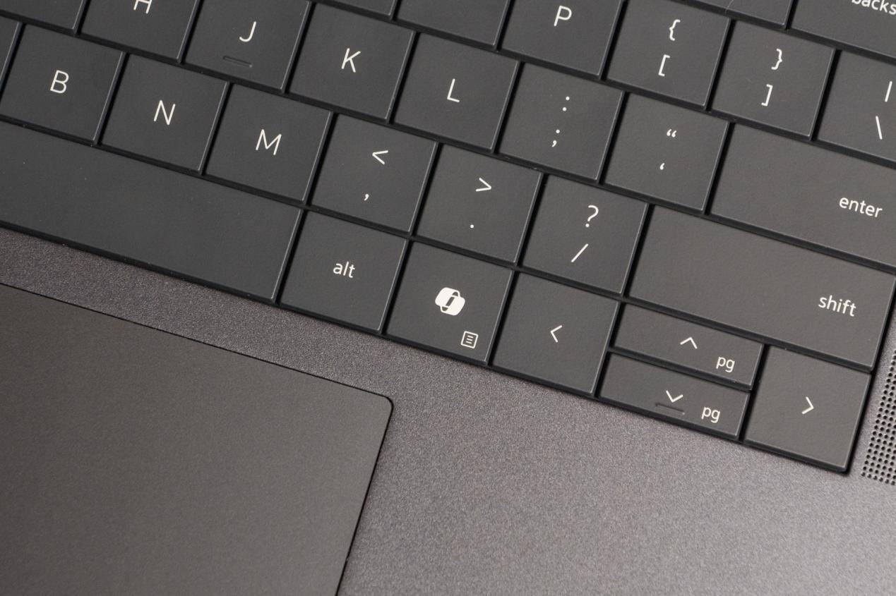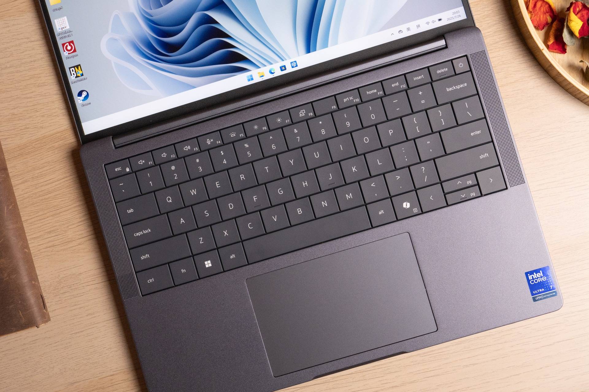 打开机身,C 面布局延续了这代 Dell Pro 系列一贯的简洁风格。键盘采用 “零框架”设计,按键间几乎无边框隔断,键帽面积较大,回弹手感干脆。虽然整机轻薄,但键程手感并不松垮,支持 Mini LED 背光,功耗更低,也进一步增强了续航表现。