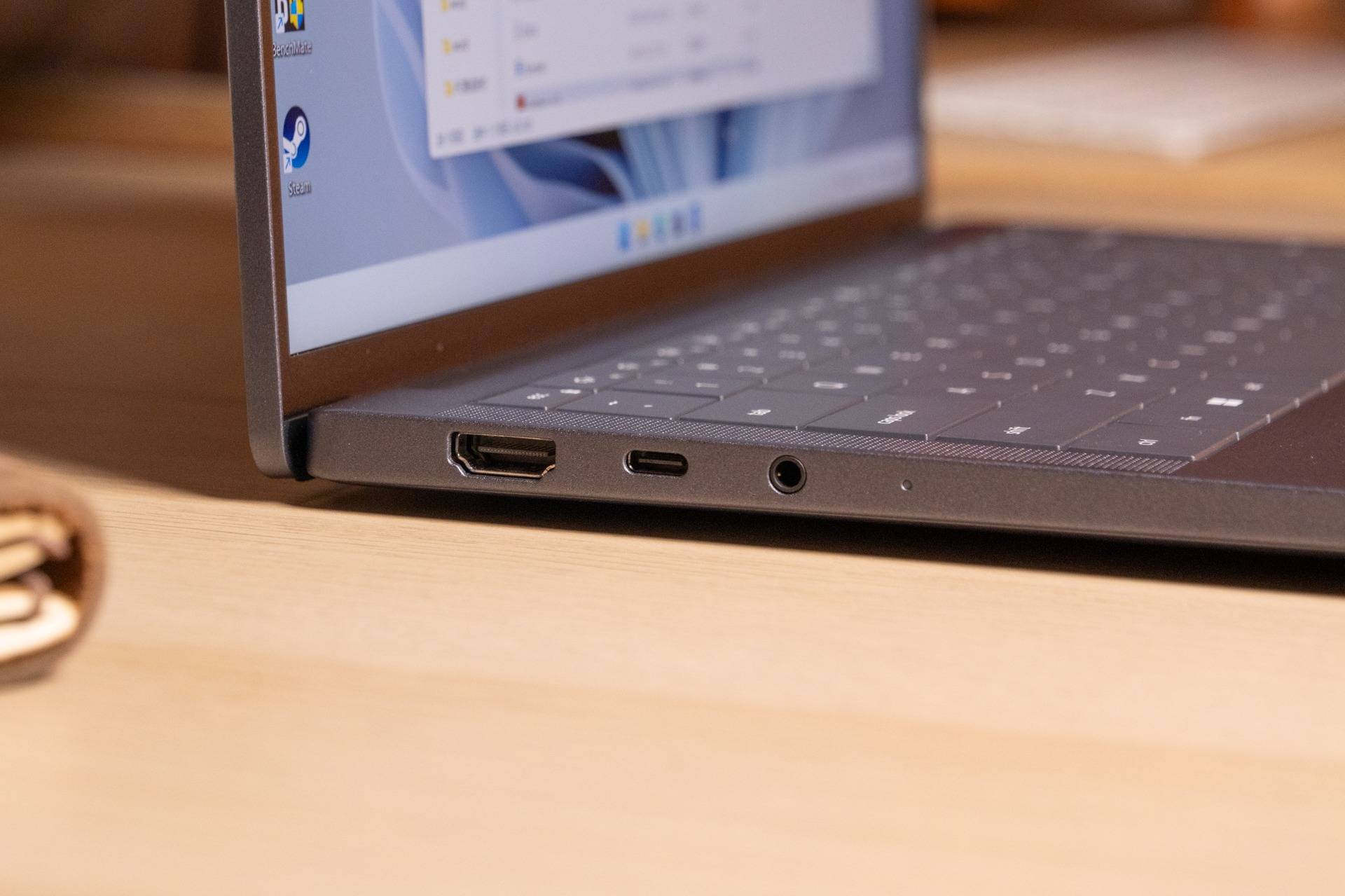 接口方面,在轻薄机身中保留了 2 个 Thunderbolt 4(USB-C) 接口、1 个 USB-A 3.2 Gen1、1 个 HDMI 2.1 全尺寸口,以及 3.5mm 耳机麦克风二合一接口。对于日常扩展、外接投影或显示器完全够用。