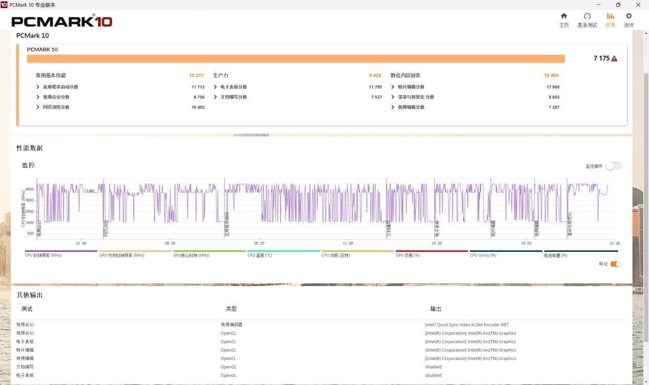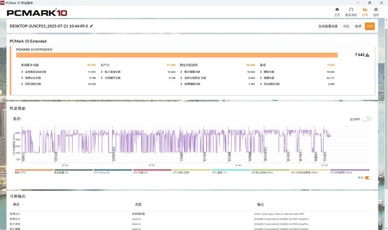 PCMark 10 和PC Mark 10 Extended综合得分,分别达到7175和7642,在日常应用、常规办公和浏览、视频会议等任务中表现稳定;而 Extended 版测试中加入的图形创作与轻度游戏场景,也进一步验证了这款轻薄本在多任务和内容处理方面的综合能力。