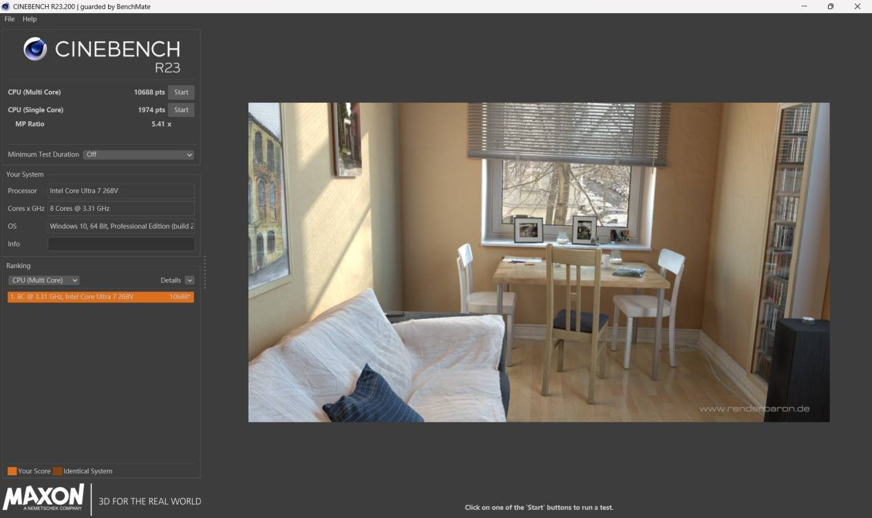 在实际测试中:Cinebench R23 单核得分为1974,多核达 10688,在 Cinebench R23 中,这颗 17W TDP 的 Core Ultra 7 268V 单核得分达 1974,多核为 10688,单核表现已接近高端标压 i7 处理器,多核也可媲美部分中端 35W~45W 平台处理器,性能释放远超传统低压轻薄本的水平。