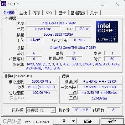 Core Ultra 7 268V基于Meteor Lake架构,采用P+E核心设计,拥有8核心、8线程,最高睿频5.0GHz,并内置一颗算力高达48 TOPS的NPU(神经网络处理单元)。在常规多任务处理之外,它还具备更强的AI推理能力,适用于图像增强、视频虚化、会议降噪、文档生成等本地AI场景。